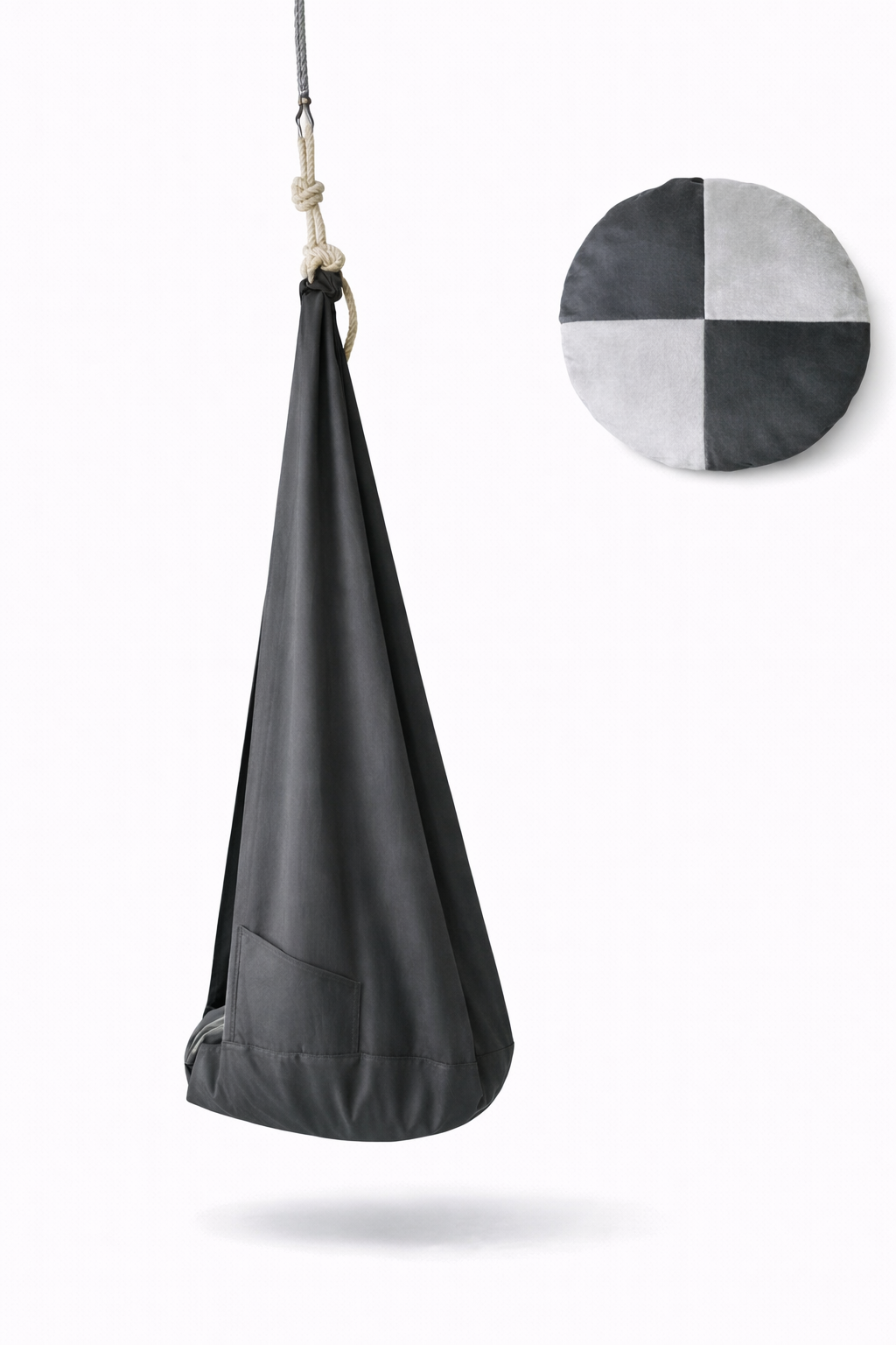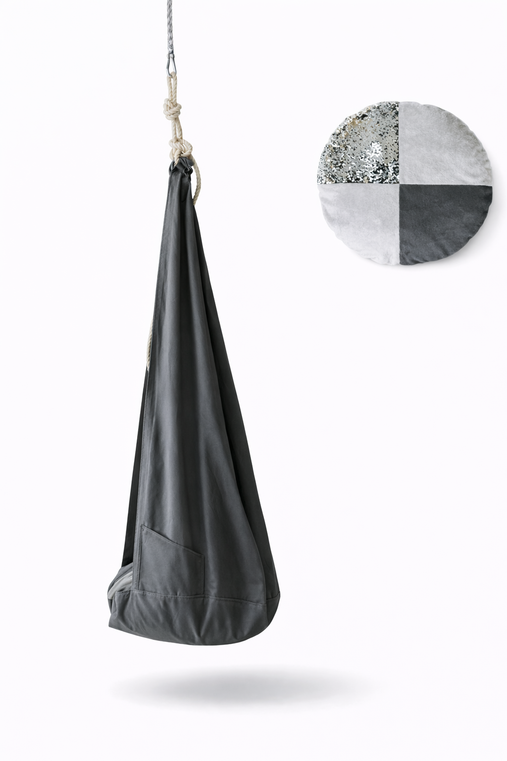 Kokon huśtawkę możesz kupić w wersji „bez poduszki” lub „z poduszką”. Poduszka stabilizuje siedzenie w kokonie i świetnie sprawdza się przy mniejszych użytkownikach. Z myślą o poszukiwaczach sensorycznych zmysłów – uszyta jest z 4 kawałków tkanin – cekinów, polaru minky i tkaniny jednokolorowej – jest dopasowana do koloru kokonu.