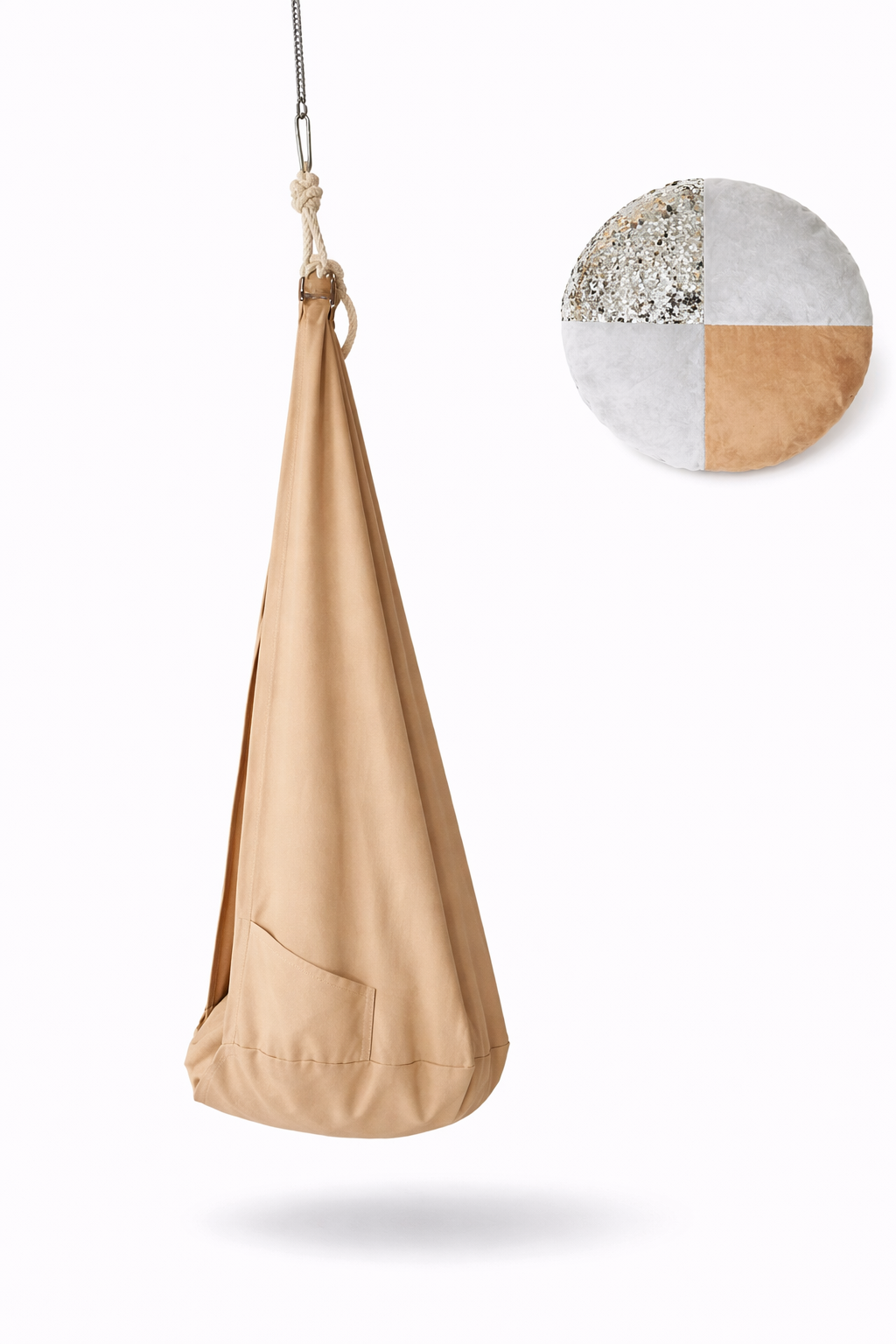 Kokon huśtawkę możesz kupić w wersji „bez poduszki” lub „z poduszką”. Poduszka stabilizuje siedzenie w kokonie i świetnie sprawdza się przy mniejszych użytkownikach. Z myślą o poszukiwaczach sensorycznych zmysłów – uszyta jest z 4 kawałków tkanin – cekinów, polaru minky i tkaniny jednokolorowej – jest dopasowana do koloru kokonu.